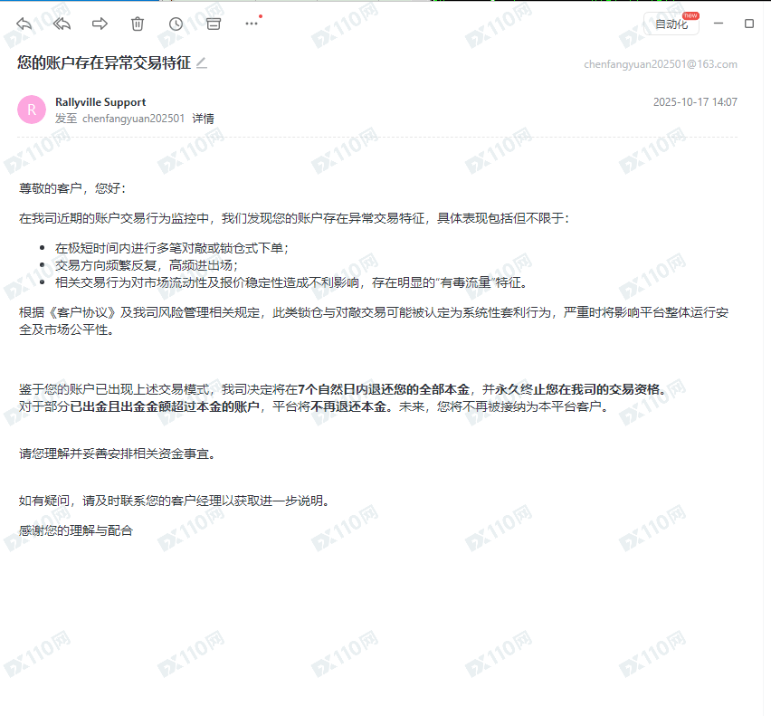 您好,您的投诉已转达给Rallyville Markets平台,若收到回复,我们将在此更新进度。
