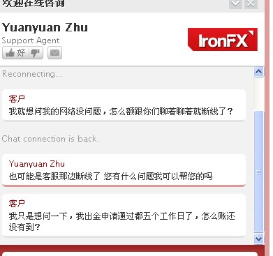 在QQ问客户经理十问九不答,在铁汇官网询问LIVE CHAT说了不到两句自动断线,好几个LIVE CHAT线路都是这样,一问到我的出金为什么那么久还没有到账就断线,断线之后就提示聊天结束。问QQ的客户经理,就说星期一写邮件去后台催一下,先别说其他的,银联出入金会拖这么久?让我写邮件催是不是到他回答我的这一刻还是没有出金给我?