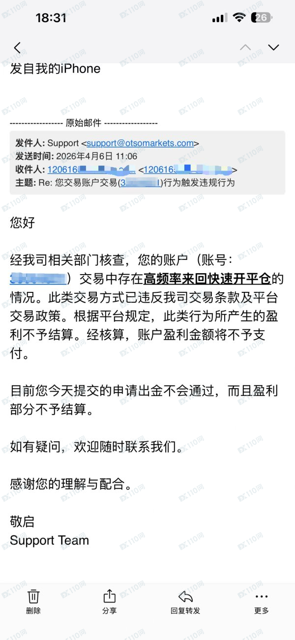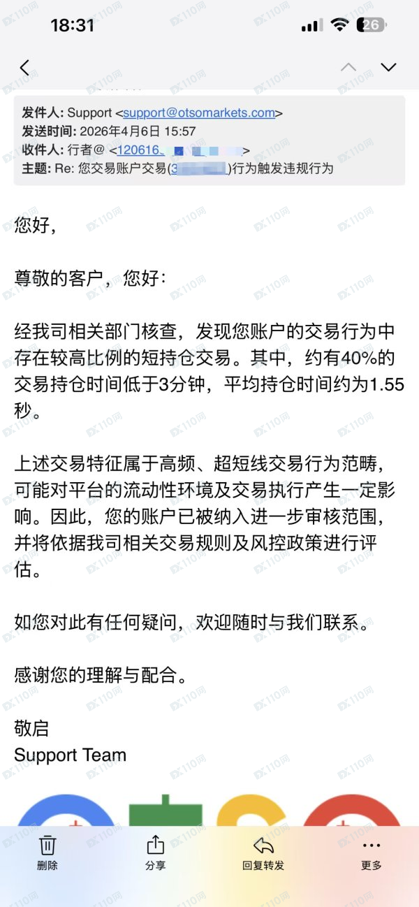 OTSO这是一家典型的"以违规交易和高频交易违规"为借口,本质是"客户盈利=平台亏损"的对赌模式"盈利不让客户出金也没有合理解释,平台内部群交流直接不让出金,你看看你们自己吃相有多难看!
